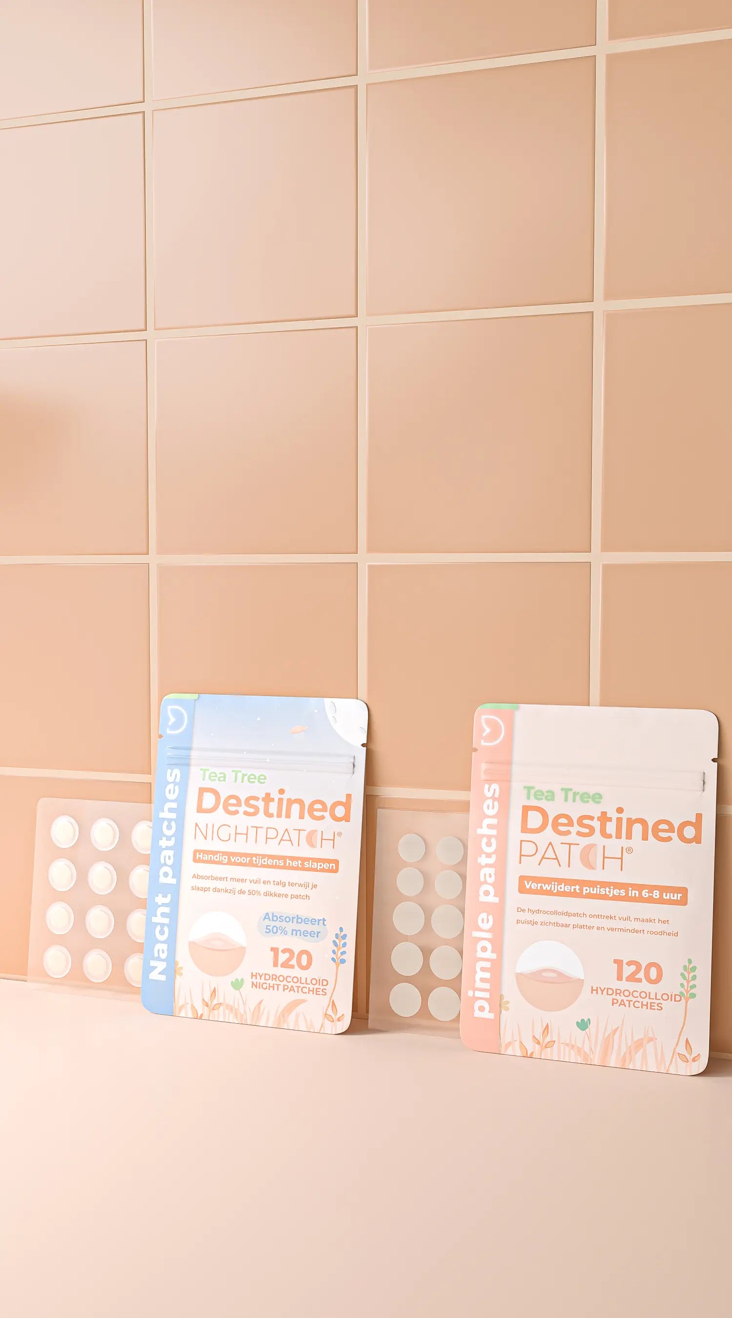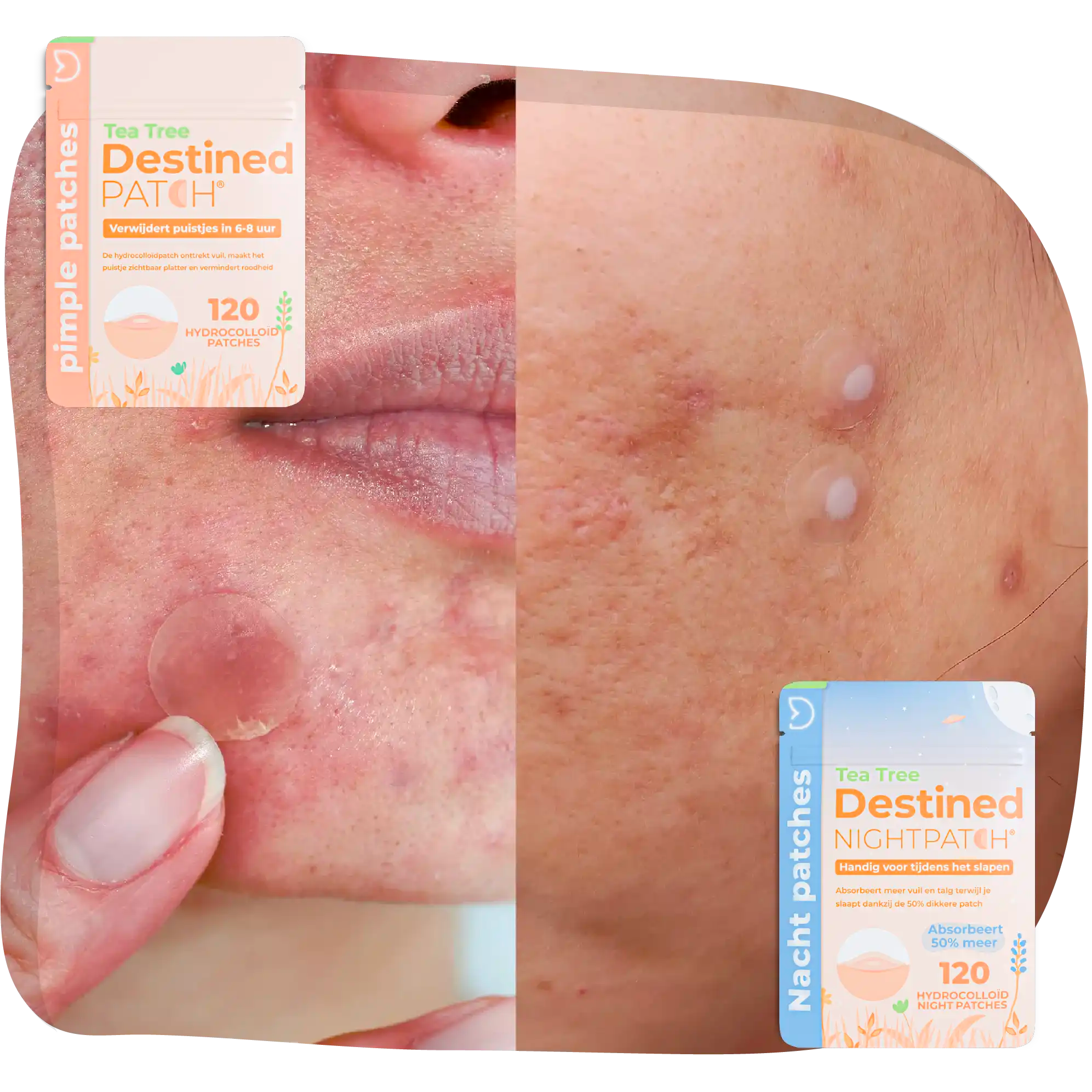 De Dag Patch is ultradun en huidkleurig — ontworpen voor onzichtbaar gebruik overdag, ook onder make-up. De Nacht Patch is dikker met meer hydrocolloid per patch, voor een intensievere absorptie terwijl je slaapt. Beide bevatten medisch hydrocolloid en tea tree. Voor het volledige effect gebruik je ze allebei: overdag de Dag Patch, 's nachts de Nacht Patch.